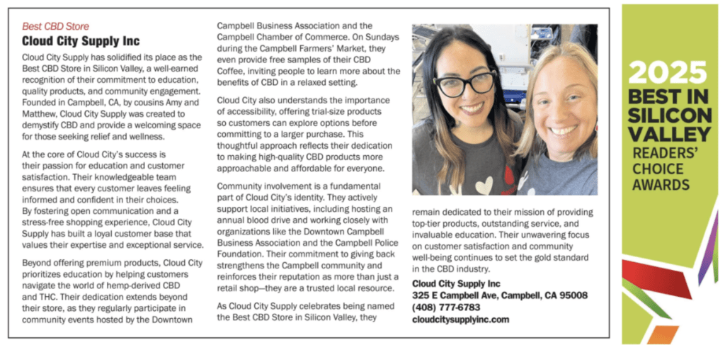 It’s official (again)! Mercury News readers have crowned Cloud City Supply the first-place winner for Best CBD Store. This announcement marks the third consecutive year Mercury News readers have ranked the downtown Campbell cannabis store with such high honors, only made possible by the continued support of its loyal, engaged community members and CBD shoppers year after year. Cloud City is humbled and immensely grateful to be recognized as a trusted source for CBD products, education, and community connection.