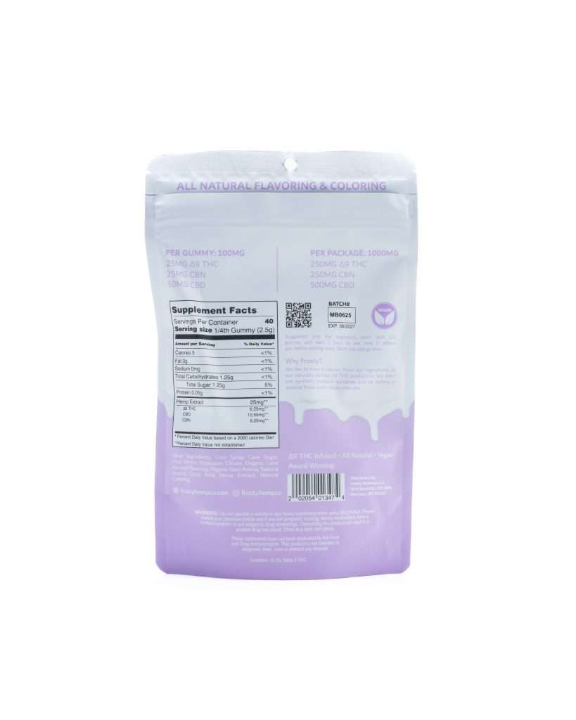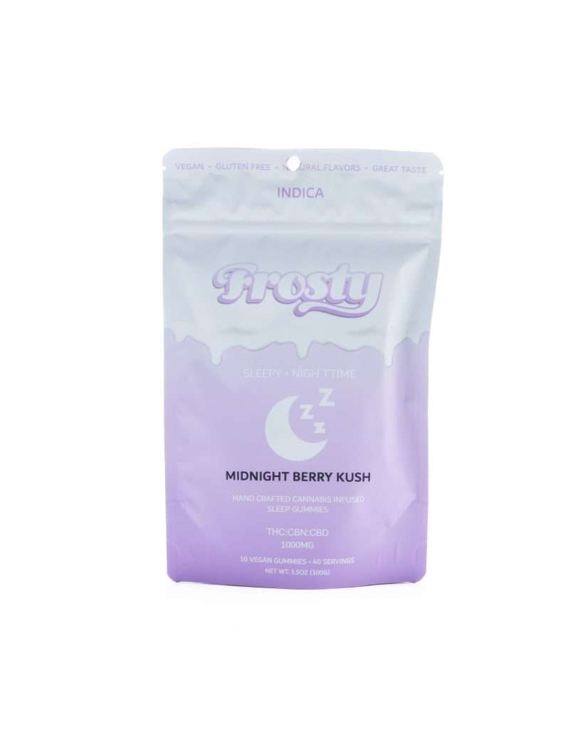 Frosty Night Sleepy Midnight Berry Kush Delta 9 THC Gummies feature 100mg total cannabinoids per gummy, combining 25mg Delta 9 THC, 25mg CBN, and 50mg CBD for deep relaxation and restful sleep. Infused with indica terpenes and natural berry flavor. Available in packs of 10.